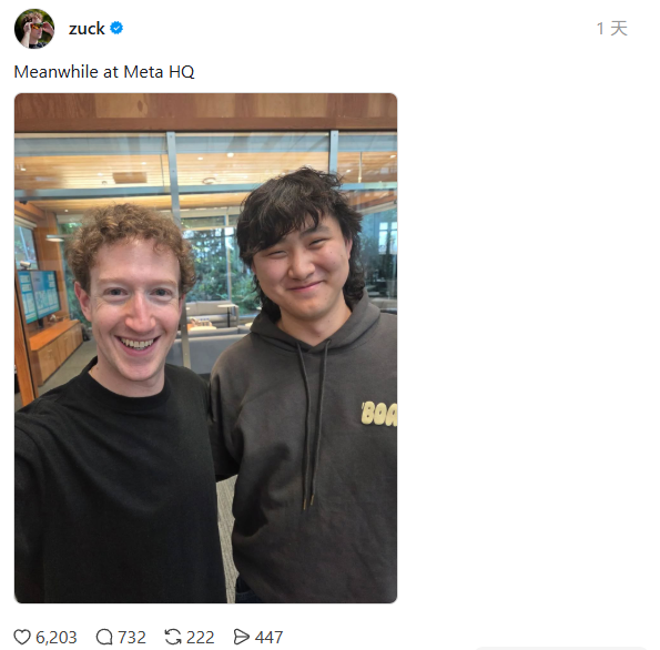但关于wang同学和meta的流言也蛮多的。一直有传言说他和小扎不对付,还说现在已经差不多算是离职状态了。最近小扎还特意发照片出来辟谣。