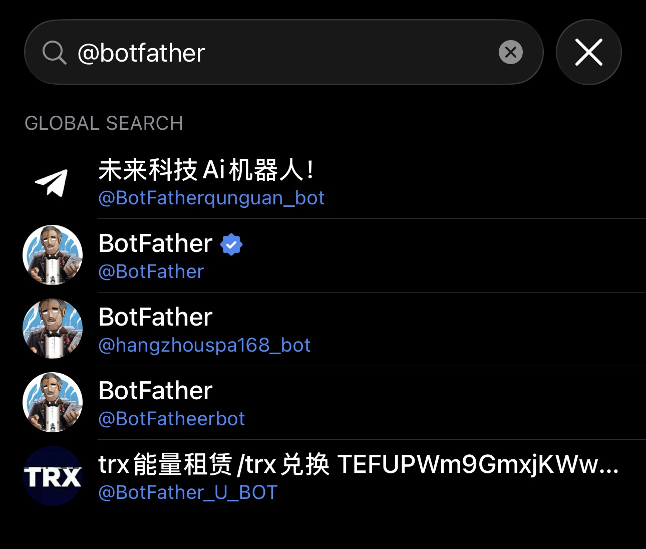 在Telegram里搜索 @BotFather ,选择那个蓝V的