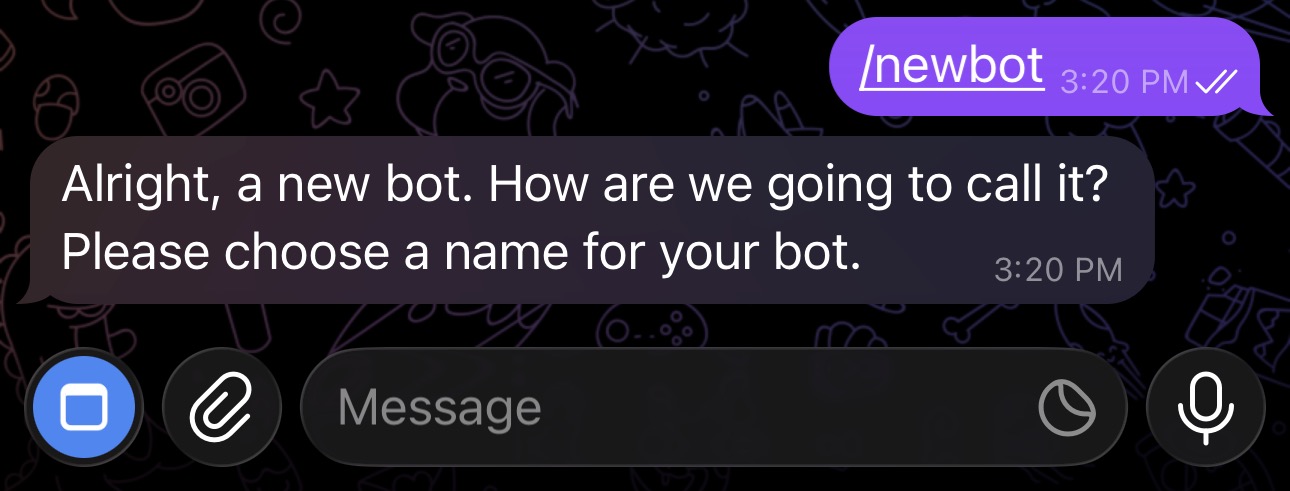 按提示给机器人取个名字,以及一个英文的username(说出来难以置信,这一趴是我耗时最久的… 起名儿不容易…)