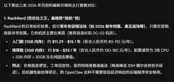 - 推荐配置:4GB内存,约$43.88/年(315元左右),让小龙虾能大展拳脚