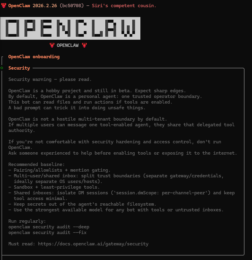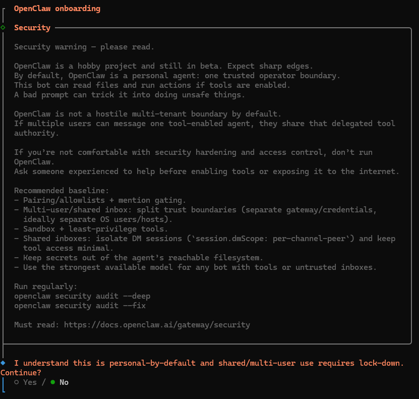 向导首先会弹出一大段安全警告,核心意思是:“这是个人专属AI助手,如果给了它操作权限,不要暴露给陌生人,否则可能被提示词注入攻击。”