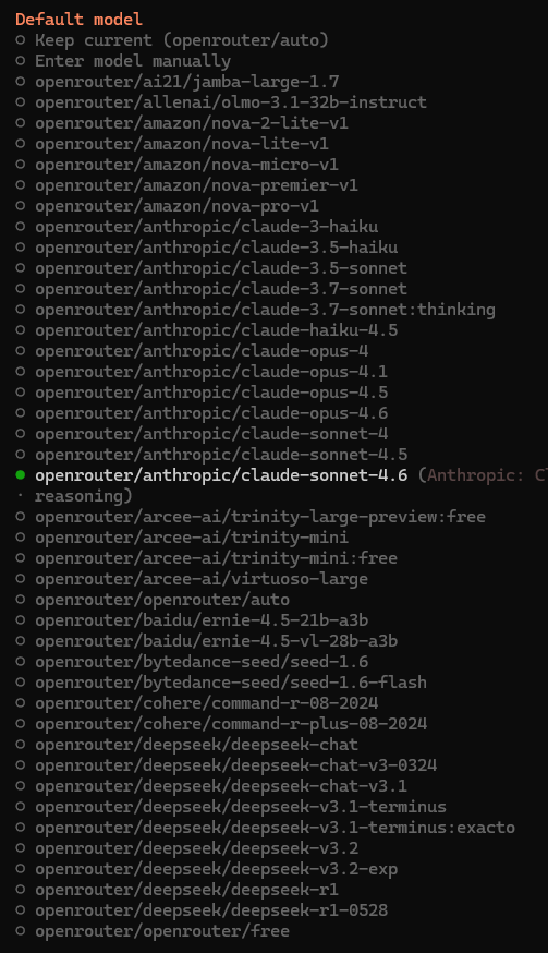 API Key验证成功后,会弹出一个长长的模型列表。因为OpenClaw最大的魅力是"工具调用能力"(比如读写文件、执行命令等),强烈建议选择我最喜欢的anthropic/claude-sonnet-4.6。非常强了,仅次于Opus,但是Opus实在太贵,我们小白很可能胡乱玩个几次就烧掉大量token。
