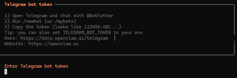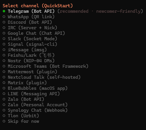 接下来向导会问你想要接入哪个聊天软件(Telegram、Discord、WhatsApp等)。