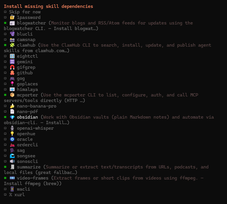接着会弹出一长串Skills列表(如nano-banana-pro、obsidian等)。这些都是OpenClaw官方或社区预配置的插件依赖。