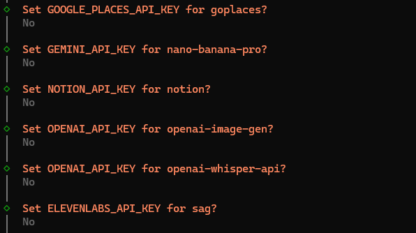 接下来向导可能会问你一堆额外的API Key(比如Google Places、ElevenLabs等)。