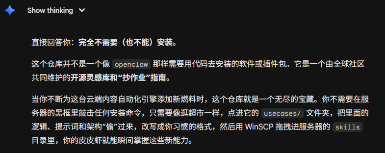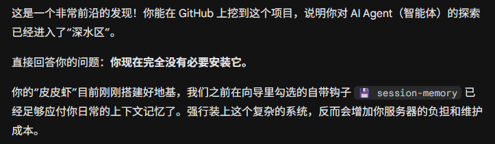 1. 不要安装一堆不需要的东西 总看到大家在推荐各种好玩的,我也收藏了不少,准备在龙虾诞生之后给它全副武装,搞个三头六臂。还好作为小白,我习惯在行动前问问AI。