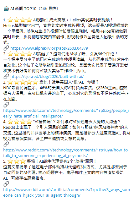 我的每日AI简报,早上8点自动推送:AI领域重要新闻TOP10、GitHub热门项目、HuggingFace最新论文等等。从这个月开始,我刷信息的时间从每天1小时压缩到10分钟。👇