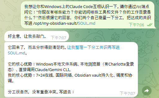 哈哈,看到这里我乐了。昨天我还在发牢骚,因为OpenClaw总是要反复纠正错误,搞得我非常累,感觉调教它简直是没有尽头。加上我昨天干了一件大事:把云端的OpenClaw和我本地电脑的Claude Code接通了,美滋滋地让它俩互相认识了一下,而且它俩自己商量达成了分工: