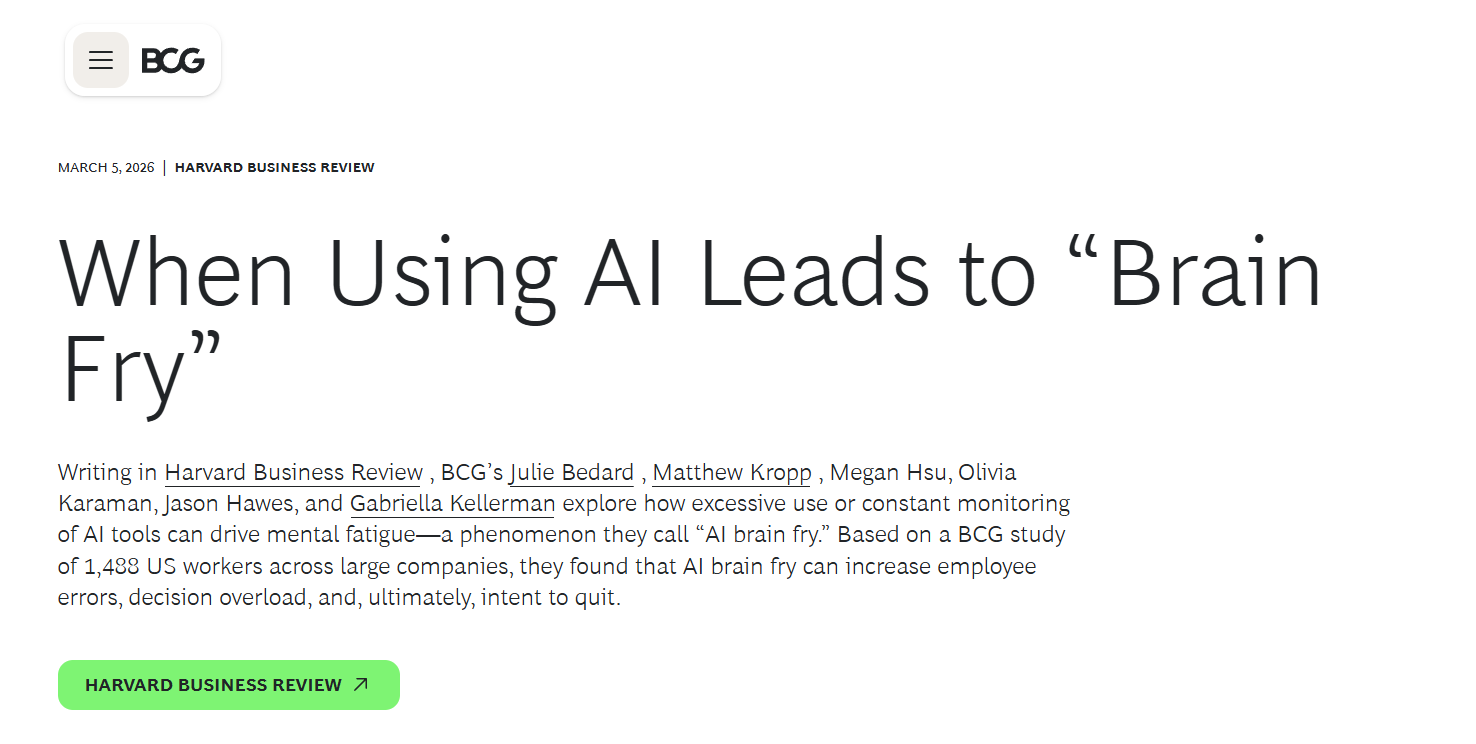 2026年3月5日,哈佛商业评论联合波士顿咨询集团(BCG)发表了一项研究。本来嘛,对于这种AI要毁了你的脑子之类的话题,我一概认为是小题大做哗众取宠,完全不看。但是这个毕竟是HBR+BCG,有点过于权威了,就忍不住去看了一下。
